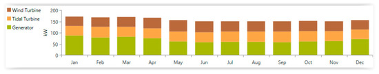 Table 10 depicts the optimization results for a possible alternative scenario that can balance wind and tidal generation, 1W + 10T, which has a renewable fraction of 52.7%. However, the capital cost, operating cost, and NPC are higher than 2W + 2T or 2W + 4T. The COE also becomes higher.