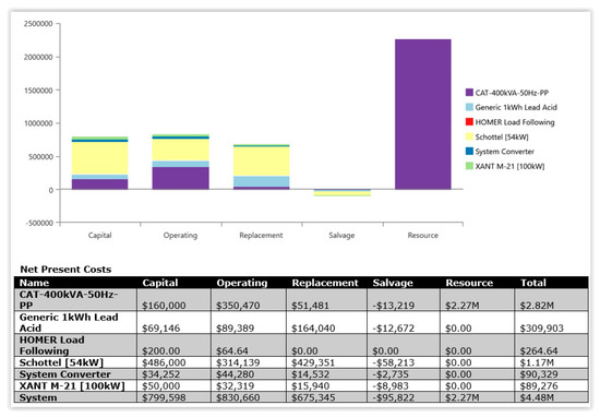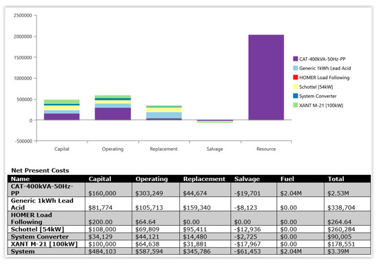 Construction: The cost of project installations is not shown, because HOMER Pro’s financial analysis module does not include this. (It just compares equipment, operating and resource costs).