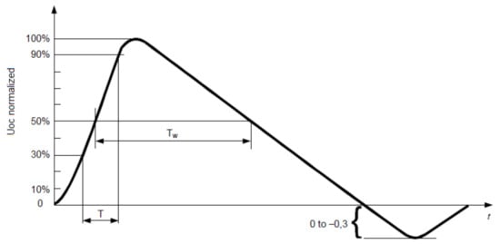 where, t is the time in μs (t ≥ 0), Vp is the peak value, A = 1.037, τ1 = 0.4074 µs, and τ2 = 68.22 µs.