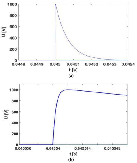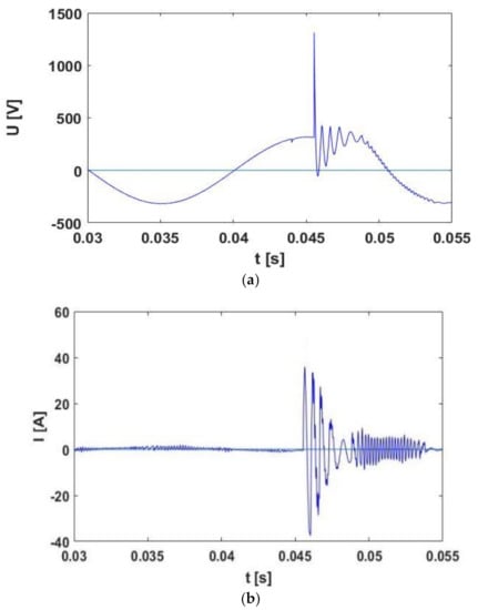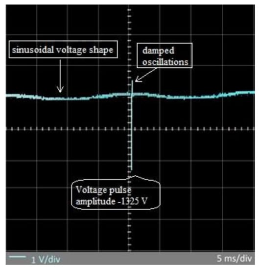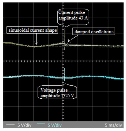 The value of the surge voltage amplitude in the circuit was 1325 V, while the value of the current amplitude at the moment of the surge was 38 A for the positive polarization, and for the negative polarization −1325 V and −36 A respectively. The modeled voltage and current waveforms are presented in Figure 8a,b for the positive polarization and in Figure 9 and Figure 10 for the negative polarization.