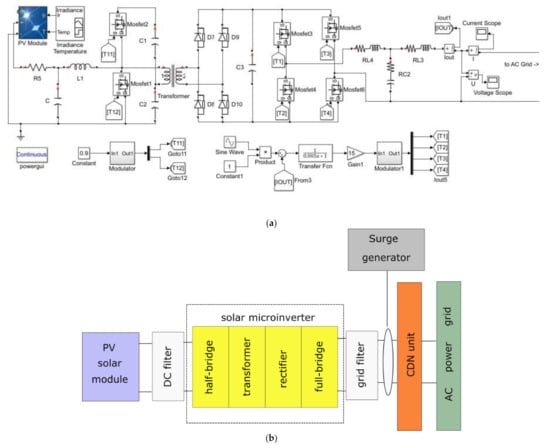 The structure of the tested system consisting of a photovoltaic module with a microinverter: (a) Detailed description. (b) Block description.