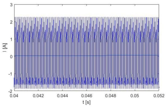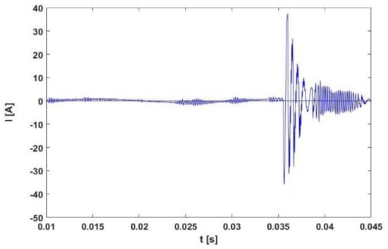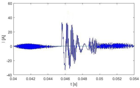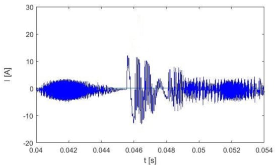 As a complement, the authors also analyzed in Matlab/Simulink software current waveforms in three selected places of the tested system: behind the transformer and in the front of the rectifier bridge, before the H-bridge and after the H-bridge but before the grid filter (Figure 11, Figure 12 and Figure 13). The highest value of the amplitude of the current signal at the moment of introducing the voltage surge occurred before the H-bridge, analyzing the system from the surge generator side towards the DC part of the installation. As a result, a damage of two metal-oxide-semiconductor-field-effect transistors in the H-bridge structure was found after verification of the tested microinverter.