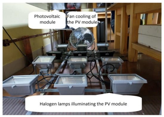 In order to confirm the correctness of the conducted computer simulation, a laboratory test stand was provided for the analyzed photovoltaic system. Figure 14 presents a part of the stand, which consists of the PV module lit with a set of halogen lighting fittings with a total power of 6 kW.