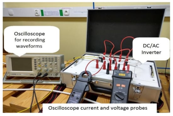 The transformer inverter in the input section used for the tests comprises a DC/AC converter in the half-H bridge circuit with a square wave output, including the stabilization and filtration system. After the repeated filtration of the variable component from voltage on the secondary side of the high-frequency transformer, in the full-wave rectifier circuit with a low pass filter, the proper formation of the output voltage in the full-bridge circuit takes place, including further filtration, before synchronization with the power grid. An important advantage of the used two-step inverter is its high efficiency when compared to other converters (dependent on the load and DC voltage levels) and the guarantee of the galvanic isolation of the AC and DC side. The object used for the tests is a grid inverter, which means that it is possible to transmit electricity to the power grid (as opposed to the island inverters operating in dedicated circuits with the function of charging electricity storages). The grid inverter, in the event of power failure, is switched off, which is the result of the application of protection against island operation, and thus protection against potential electric shocks to operating staff [32,33,34].
