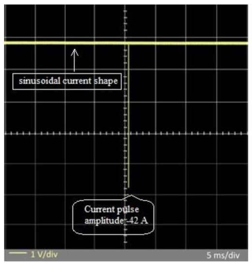 The first inverter was damaged during the first test; the second one was disturbed by a series of five pulses. The test results for the second inverter were listed in Table 5, and examples of the waveforms were presented in Figure 16, Figure 17, and Figure 18.