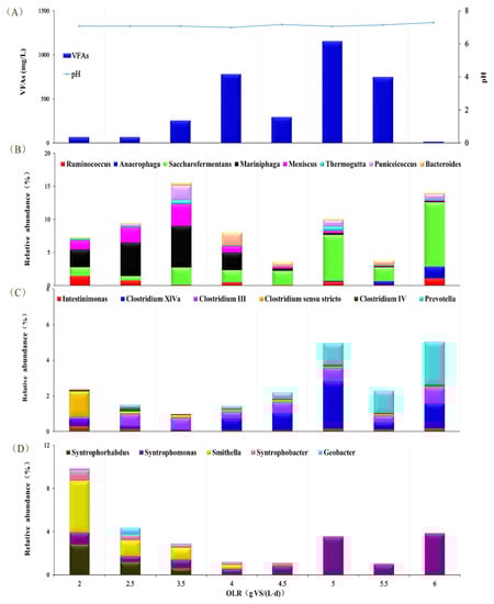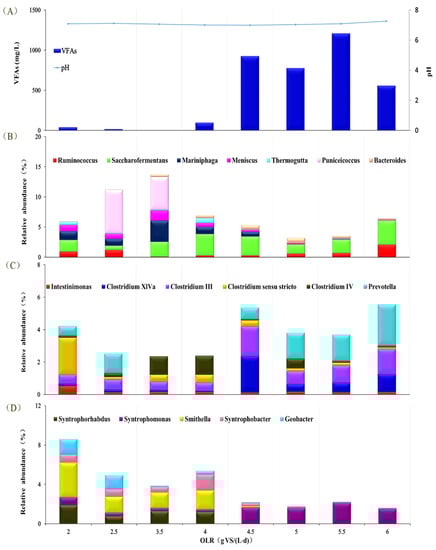 At the genus level, the bacteria included Ruminococcus, Anaerophaga, Mariniphaga, Saccharofermentans, Bacteroides, Intestinimonas, Meniscus, Prevotella, Thermogutta, Puniceicoccus, Clostridium, Geobacter, Smithella, Ornatilinea, Levilinea, Syntrophorhabdus, Syntrophobacter, Syntrophomonas, Sedimentibacter, Proteiniphilum, Leptolineas, Aminivibrio, Anaerovorax, Pseudomonas, and Cloacibacillus. Among these bacteria, Ruminococcus, Anaerophaga, Mariniphaga, Saccharofermentans, Bacteroides, Intestinimonas, Meniscus, Prevotella, Thermogutta, Puniceicoccus, and Clostridium participated in the hydrolysis/acidogenesis phase of GM11. The relative abundances of these bacteria varied as OLRs changed (Figure 1B–D). The relative abundance of Ruminococcus ranged from 0.06 to 1.47%. Increases in the relative abundances of Anaerophaga (a peak value of 1.79%) and Saccharofermentans (a maximum value of 9.72%) were observed as OLRs increased to 6.0 g VS/(L·d), coupled with a decrease for Mariniphaga and Meniscus.