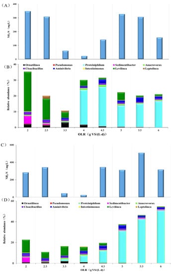 For both co-digestion systems, there was a shift in protein-degradation bacteria that appeared as the OLR changed. Proteiniphilum has the ability to convert peptone, arginine yeast, glycine, and extract to NH3 and acetate [,]. Levilinea converts amino acids to lactate, acetate, and H2 []. Ornatilinea ferments carbohydrates and polypeptides, including microcrystalline cellulose, with the production of H2, ethanol, and acetate []. Sedimentibacter ferments proteins to produce VFAs through Stickland-type reactions []. Regarding the variation of relative abundance, the dominant bacteria included Ornatilinea, Sedimentibacter, and Levilinea at an OLR of 2.0 g VS/(L·d), Ornatilinea and Levilinea at an OLR of 2.5–3.5 g VS/(L·d), and Proteiniphilum with further increased OLRs. He et al. [] found that Proteiniphilum became the dominant genus in a system of digested kitchen waste.