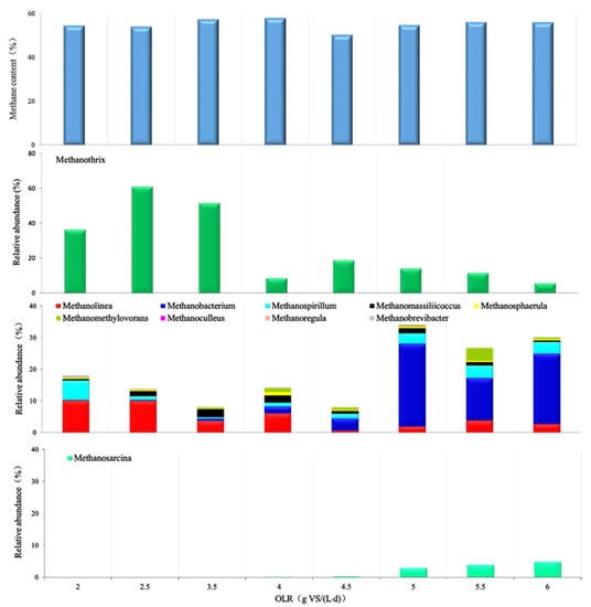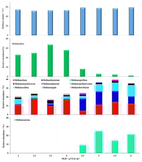 For GM11, the methane content averaged 50.26–57.95%. The formation of methane was completed by various methanogens, including the genera Methanothrix, Methanolinea, Methanobacterium, Methanospirillum, Methanomassiliicoccus, Methanosphaerula, Methanoculleus, Methanomethylovorans, Methanoregula, Methanobrevibacter, and Methanosarcina (Figure 3). The dominant methanogens varied as OLRs increased, suggesting that a shift in the methane-forming pathway appeared. Methanothrix was the dominant methanogen at OLRs of 2.0–3.5 g VS/(L·d) and accounted for 36.34–60.88% of the total reads of archaea, indicating that the acetoclastic mode was the main conversion pathway. When OLRs increased to 5.0–6.0 g VS/(L·d), the total relative abundance of hydrogenotrophic methanogens, including the genera Methanolinea, Methanobacterium, Methanomassiliicoccus, Methanosphaerula, Methanoculleus, Methanomethylovorans, Methanoregula, and Methanobrevibacter increased to 26.77–34.01%, with a particularly notable increase in Methanobacterium. The relative abundance of Methanothrix decreased to 5.63–14.12%.