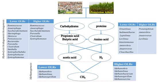 In conclusion, an obvious effect of OLRs on the microorganism community was observed for both co-digestion systems (Figure 6). The microorganisms responsible for the hydrolysis/acidogenesis/acetogenesis phase of carbohydrate degradation, such as Saccharofermentans, Prevotella, Clostridium, and Syntrophomonas, became the dominant microbes as the OLR increased. Similarly, for conversion of nitrogen compounds, Proteiniphilum and Levilinea became the dominant genera. For methanogens, the dominant genus shifted from Methanothrix to hydrogenotrophic and multifunctional methanogens. Similarly, Kim et al. [] found that Petrimonas, Syntrophomonas, Proteiniphilum, and Fastidiosipila were the dominant bacterial genera that contributed to hydrolysis and fermentation in a system treating food waste-recycling wastewater.
