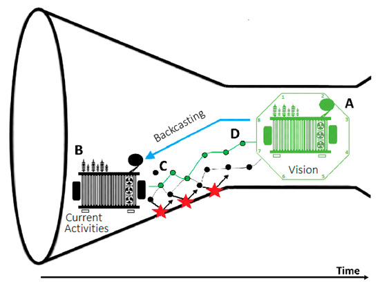 A long-term strategic perspective is crucial when working with sustainability to ensure that actions lead in the right direction towards full sustainability and contribute to the own organization’s competitiveness. In order to be strategic, it is necessary to know the desired vision of success. This comes with the challenge of defining sustainability in a way that is neither too broad, not providing any guidance in practice, nor too specific, making it difficult for people to agree and risking becoming obsolete in the face of, for example, new technology advances. Within the Framework for Strategic Sustainable Development (FSSD), the following principle-based definition of sustainability is used: In a sustainable society, nature is not subject to systematically increasing (1) concentrations extracted from the Earth’s crust, (2) concentrations of substances produced by society, (3) degradation by physical means; and people are not subject to structural obstacles to (4) health, (5) influence, (6) competence, (7) impartiality, and (8) meaning-making [33,34,36]. These eight principles represent the root-causes of unsustainability, up-stream in cause-and-effect chains. Thereby, the myriad unsustainability-related impacts in social and ecological systems, such as climate change, biodiversity loss, ozone depletion, discrimination, etc., can be related to a few comprehensive mechanisms of destruction. These eight principles can be used as boundary conditions for the re-design of socio-technical systems. They can be used to create that vision, which is necessary to be able to be strategic. This provides the basis for backcasting, i.e., starting the planning process with the end in mind, asking what is necessary to happen in order to reach the vision over time. Thereby, the direction of change can be anticipated, enabling decision-making that makes sure to be on the right track and giving benefits to the organization, e.g., by being ahead of legislation or meeting new customer demands [37]. The funnel metaphor of the FSSD can be used to understand the sustainability challenge and the self-benefit of strategic sustainability thinking based on backcasting from a vision framed by the eight sustainability principles [34,36,38] (see Figure 1).
