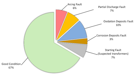 The category of “Arcing Fault” is at 6% of the fault mode. The arcing fault can be indicated by detecting a high concentration value above the caution limit of the two gases, hydrogen and acetylene. This arcing can generate extremely high temperatures over 700 °C, though for a short time, in the oil, leading to fire accidents [4,13,16]. The category “Partial Discharge Fault” is at 7% of the fault mode. Partial discharge can be indicated by detecting a high concentration value above the caution limit of the hydrogen gas in the oil. This fault can occur at any temperature over 200 °C [4,13,16]. The category of “Oxidation Deposits Fault” is at 10%, the most dominant fault mode. Oxidation products such as acidity may convert to ester and thereafter form sludge deposits on the transformers’ windings. This fault can be indicated by detecting a high concentration value above the caution limit of the acidity in the oil [5,15]. The category of “Corrosion Deposits Fault” is at 3% of the fault mode. The corrosion deposits are in the form of copper sulfide on the windings of the transformers. This fault can be indicated by detecting a high concentration value above the caution limit of the hydrogen sulfide gas and toluene compound in the oil [2]. The category “Starting Fault” is at 7% of the fault mode. This category represents the transformers with suspected failure propagation, that have a fault in progress and need corrective action. The investigation in this study focused on the “Starting Fault” category to apply a model of early fault diagnosis in order to follow up the fault before progression to a risky level. The last category “Good Condition” represents the transformers which have not any fault’s indication.