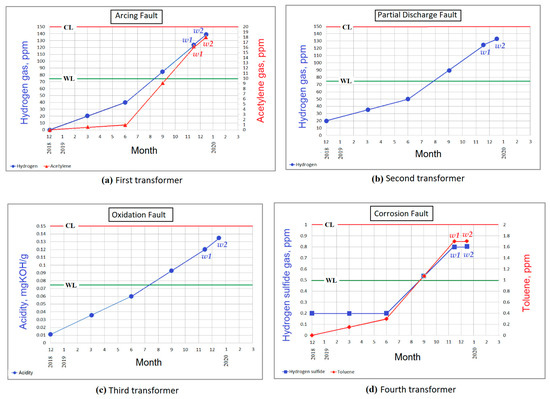 Fault trend chart of the four transformers with suspected failure propagation. CL= Caution Limit; WL= Warning Limit; w1 = First measured value; w2 = Second measured value. (a) Chart of “Arcing Fault” for the generation of the gases hydrogen and acetylene in the first transformer registered serial number 107772 (Power rate = 20 MVA, HV = 33 kV); (b) Chart of “Partial Discharge Fault” for the generation of the hydrogen gas in the second transformer registered serial number 20081807 (30 MVA, 132 kV); (c) Chart of “Oxidation Deposits Fault” for the generation of the acidity in the third transformer registered serial number 3247PG1548 (300 MVA, 275 kV); (d) Chart of “Corrosion Deposits Fault” for the generation of the hydrogen sulfide gas and toluene compound in the fourth transformer registered serial number 07MD970101 (30 MVA, 132 kV).