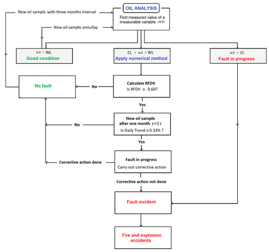 The flow diagram starts with oil analysis of the first measured value (w1) representing any related measurable variable. There are three alternative evaluation outcomes for the w1. The first is w1 less than WL, which reveals good condition of the transformer, hence a new oil sample could be recommended annually according to [15] or according to the organization maintenance plan. The second is w1 more than CL, which indicates a fault in progress, i.e., fault has already occurred and may lead to fire and explosion accidents. The last is w1 more than WL and below CL, which reveals the probability of having a fault in the initial stage. In this last alternative, the numerical method could be applied to assess the fault level and carry out appropriate corrective action to prevent fault incidence. If the fault is not in the risky level, the oil sample could be recommended for analysis with three months interval according to [2], in order to gather sufficient data for an accurate evaluation of the fault’s progression. The generic procedure described in Figure 4 provides a structured process for CBM purposes using any measurable variable at any caution limit. The main advantage of applying the numerical method is the possibility of early faults detection before progression to a risky level. The disadvantage is the requirement of historical data to track the fault level.