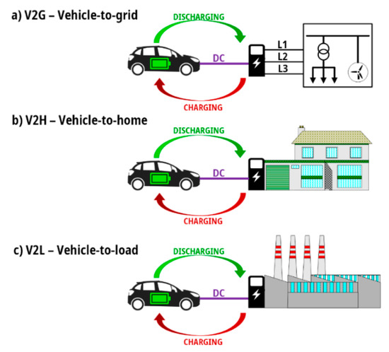 The European Union’s policy of emission neutrality introduces further restrictions on the use of internal combustion engine (ICE) passenger cars [1]. Importantly, the process of achieving carbon neutrality does not only apply to EU countries. It is a global trend that, apart from efforts in the transport sector, also affects other industry branches [2,3]. However, it should be kept in mind that the transport sector is a major source of carbon dioxide (CO2) emissions [4,5]. Therefore, the transformation of public and private transport to zero-emissions has been ongoing for several years. This can be achieved by popularizing electric vehicles (EV) [6,7]. The development of electromobility in recent years has significantly accelerated. Many factors have contributed to this, such as the introduction of incentives and benefits, restrictions on the entry of ICE vehicles into city centers imposed by the EU and local authorities, CO2 emission fees imposed on car companies, and increased public awareness of environmental issues [8,9,10]. With the introduction of electric vehicles into public space, new solutions could be observed, which will contribute to a more efficient use of these vehicles. One of such solutions is Vehicle-To-Grid (V2G) technology [11]. It involves using the energy stored in batteries of electric vehicles for the purposes of end users or even Distribution System Operator (DSO) or Transmission System Operator (TSO). Depending on the location of the EV, discharge service will take place. These needs may vary according to battery charge, grid status, or internal user preferences. There are many concepts for using EVs to supply different facilities. It can also take the form of Vehicle-to-anything also known as Vehicle-to-X (V2X) programs, where X stands for, e.g., building (V2B—Vehicle-to-Building), home (V2H—Vehicle-to-Home), general load (V2L—Vehicle-to-Load), especially used with industrial loads (V2I) [12,13]. Basic diagram of using V2X technology is presented in Figure 1.