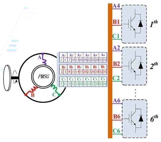 In this paper, an N*3-phase PMSM is proposed to meet the capacity demand of a high power flywheel energy storage system. The N*3-phase PMSM is composed of N motor units. The characteristics of these motor units are repetitious, and each motor unit has magnetic and electrical isolation characteristics. As an example, the structural diagram of a 6*3-phase PMSM is shown in Figure 1.