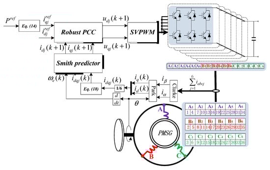 A 6*3-phase PMSM, connected with six voltage source inverters (VSIs), is used as an example as shown in Figure 3. The proposed R-PPC method of the N*3-phase PMSM drive system is illustrated in Figure 4. According to the characteristic analyses of the 6*3-phase PMSM, it is known that the control of the VSIs can be analogous to that of a conventional VSI. In this paper, a novel R-PPC method of the N*3-phase PMSM drive system is realized by using the d–q axis current robust predictive control. Using the robustness factors, the robust predictive current controller is adopted to modify the current response values, and the perfect current response under the inductance parameter mismatch can be obtained. In addition, the proposed R-PPC method can compensate for the one-beat delay of the digital control system by using the Smith predictor.