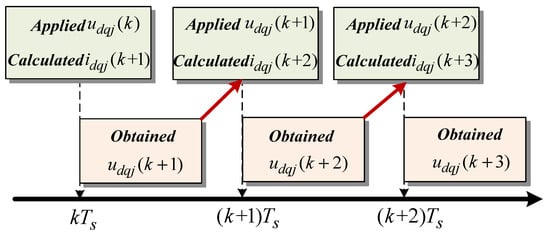 From Equation (16), it can be known that the conventional current predictive controller relies heavily on the motor parameters. Especially when the inductance parameters are mismatched, the control performance of the N*3-phase PMSM will be seriously deteriorated. In addition, there exists the one-beat delay between the reference voltage value and the actual output voltage value in the digital control system. This also degrades the performance of the predictive current controller if the one-beat delay is not eliminated in the proposed robust predictive controller. Firstly, the current response value (i.e., , ) of the moment should be obtained at the moment. The ideal voltage vector (i.e., , ) of the moment is then calculated by using the predicted current response value (i.e., , ). Figure 5 illustrates the principle of one-beat delay compensation of predictive controller.