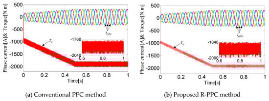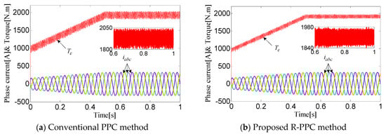 In this simulation, the inductance parameter values are stepped to 50% of their initial values to simulate the inductance parameter mismatch. Comparison simulation results of the conventional PPC and proposed R-PPC under the inductance parameter mismatch are given in Figure 6, Figure 7, Figure 8, Figure 9 and Figure 10. Figure 6 shows the comparative simulation results of the phase current and torque by using the conventional PPC and the proposed R-PPC. It can be seen from Figure 6a that the peak-to-peak torque ripple of the 6*3-phase PMSM reaches ±250 N·m in comparison to the conventional PPC method. From Figure 6b, it can be seen that the peak-to-peak torque ripple of the proposed R-PPC is reduced to ±140 N·m, which is obviously lower than that of the conventional PPC method. From Figure 6, it is known that the inductance parameter mismatch has a great influence on the torque control performance in the conventional PPC method.