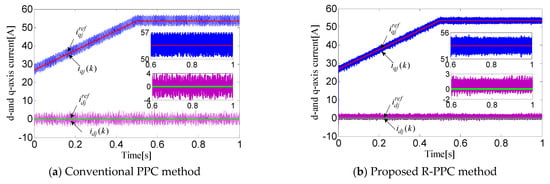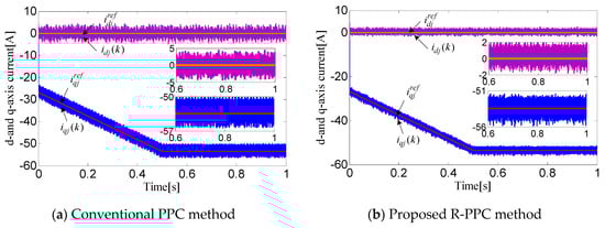 Simulation results of the d- and q-axis current under the discharge state. (a) Conventional PPC method; (b) Proposed R-PPC method.