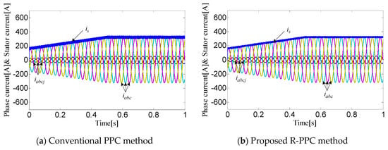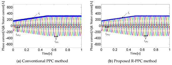 Simulation results of the phase current under the charge state. (a) Conventional PPC method; (b) Proposed R-PPC method.