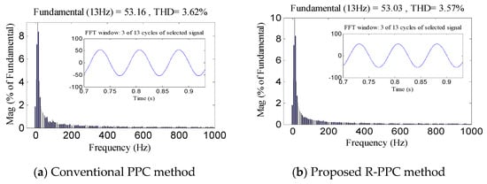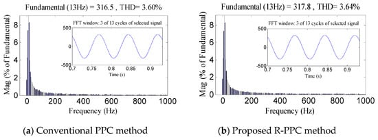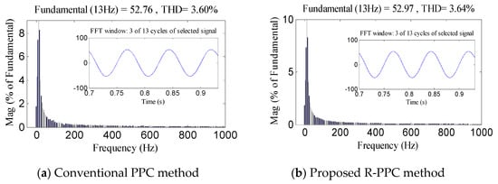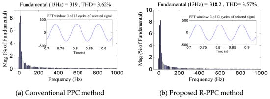 The comparative simulation results of the d- and q-axis current under the inductance parameter mismatch are shown in Figure 7. The d- and q-axis current response values can accurately track the reference values, which are clearly shown in Figure 7. However, the d- and q-axis current response peak-to-peak ripple of the conventional PPC method is significantly higher than that of the proposed R-PPC strategy. From Figure 7a,b, it can be observed that the d- and q-axis current response peak-to-peak ripples of the conventional PPC method respectively reached ±8 A and ±7 A, decreasing to ±5 A and ±5 A with the use of the proposed R-PPC method. Figure 8a presents the simulation results of the conventional PPC method, and Figure 8b presents the simulation results of the proposed R-PPC method. From Figure 8a,b, it can be observed that the phase current waveform of the 6*3-phase PMSM can both keep a perfect sinusoidal waveform by adopting the conventional PPC method and the proposed R-PPC method. From Figure 9a,b, it can be seen that the stator current fundamental values of the conventional PPC method and proposed R-PPC method are respectively 53.16 A and 53.03 A, and the THDs of the conventional PPC method and proposed R-PPC method are respectively 3.62% and 3.57%. Figure 10 shows the stator current frequency spectra of the 6*3-phase PMSM under inductance parameter mismatch. It can be seen from Figure 10a that the stator current fundamental value and the THD of the conventional PPC method are 319 A and 3.62%, respectively. The stator current fundamental value and the THD of the 6*3-phase PMSM are respectively 318.2 A and 3.57% through use of the proposed R-PPC method, which can be observed in Figure 10b. According to Figure 8, Figure 9 and Figure 10, it can be known that the inductance parameter mismatch does not affect the stator current of the 6*3-phase PMSM under the charge state. The stator current control performance of the conventional PPC method has the same superior performance as the proposed R-PPC method.