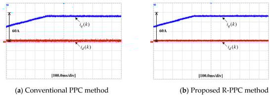 Experimental results of the d- and q-axis current under the discharge state. (a) Conventional PPC method; (b) Proposed R-PPC method.