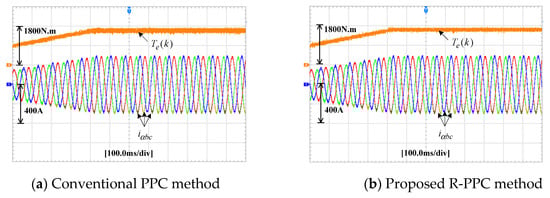 Figure 18 shows the d- and q-axis response current experimental results of the conventional PPC method and the proposed R-PPC method under the discharge state. It can be seen from Figure 18 that the q-axis response current ripple of the conventional PPC method is consistent with that of the proposed R-PPC method in the case of inductance parameter mismatch. However, the d-axis current response ripple of the proposed R-PPC method is significantly lower than that of the conventional PPC method under the inductance parameter mismatch, as clearly shown in Figure 18b. The phase current and torque experimental results of the conventional PPC method and the proposed R-PPC method under the inductance parameter mismatch are shown in Figure 19. From Figure 19a, it can be known that the inductance parameter mismatch will lead to the increase torque ripple of the 6*3-phase PMSM under the discharge state. The peak-to-peak torque ripple of the 6*3-phase PMSM is obviously suppressed when the proposed R-PPC method is adopted in the case of inductance parameter mismatch, which can clearly be observed in Figure 19b. From Figure 18 and Figure 19, it can be known that the control performance of the proposed R-PPC method for the 6*3-phase PMSM is obviously better than that of the traditional control method in the case of inductance parameter mismatch.