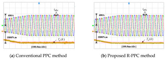 Figure 16 presents the comparative experimental results of the d- and q-axis current under the charge state. From Figure 16a, it can be seen that the d- and q-axis current response ripple of the conventional PPC method is obviously higher than that of the proposed R-PPC method in the case of inductance parameter mismatch. When the proposed R-PPC method is applied, the ripple of the d-axis current response value is obviously suppressed under the inductance parameter mismatch, as shown in Figure 16b. Figure 17 illustrates the comparative experimental results of the phase current and torque under the charge state. From Figure 17a, it is known that the peak-to-peak torque ripple of steady-state operation is significantly high by using the conventional PPC method. It can be observed from Figure 17b that the peak-to-peak torque ripple of proposed R-PPC method is obviously lower than that of the conventional PPC method in the case of inductance parameter mismatch. Therefore, it can be seen from Figure 17 and Figure 18 that the current response ripple and torque ripple of N*3-phase PMSM with the inductance parameter mismatch are obviously suppressed through the adoption of the proposed R-PPC method.