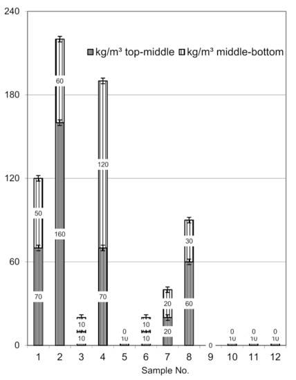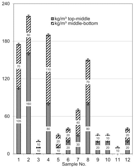 Cement slurries from the second group (Table 2) are made with G HSR drilling cement. The same as in the first group, all cement slurries have 0.1% defoaming agent. From the test results in Table 4 and in Figure 3 and Figure 4, a slight fractionation of the control cement slurry No. 7 can be seen. The difference in density is from 20 kg/m3 to 40 kg/m3. The use of a dispersant in cement slurry No. 8 increases fractionation. The difference in density is from 70 kg/m3 between the top and middle of the column to 80 kg/m3 between the middle and bottom for measuring sedimentation at an angle of 45° (Figure 4). These values are slightly above the limit value, which is 60 kg/m3. This result means that the dispersant has no effect on reducing the fractionation of the cement slurry. On the other hand, the use of the remaining additives does not cause a large difference in density in individual parts of the fractionation column. During the tests, the difference in density does not exceed 20 kg/m3. When analyzing the rheological parameters of the cement slurries, a significant increase in the value can be seen after the use of water glass in sample 10 (Figure 5). In this case, as when using bentonite, the water glass should be carefully dosed to reduce fractionation. Optionally, a small amount of dispersant can also be used. The obtained results confirm the beneficial effects of xanthan gum in cement slurry No. 10 and filter perlite in cement slurry No. 12. It is also possible to use the addition of sodium water glass, but the rheological parameters should be reduced.