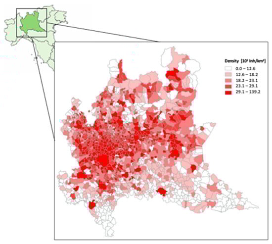 Municipalities of the Lombardy region: colors represent the density of the population in their urban area calculated from regional land use [33] and census [34] data.