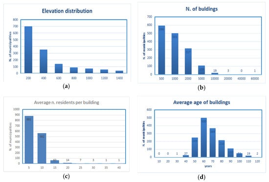 Lombardy’s municipalities characteristics: the histograms represent the distribution of the elevation of the urban centers (a); of the number of buildings (b), of the number of residents per building (a) proxy of the building size (c), and of the average building age (d).