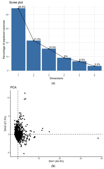 The PCA was performed on the six remaining uncorrelated attributes, which also allowed a graphical representation of any possible grouping in the domain of the first two principal components. The analysis results (performed using R programming language using the library functions stat and factoextra) are reported in Figure 3.