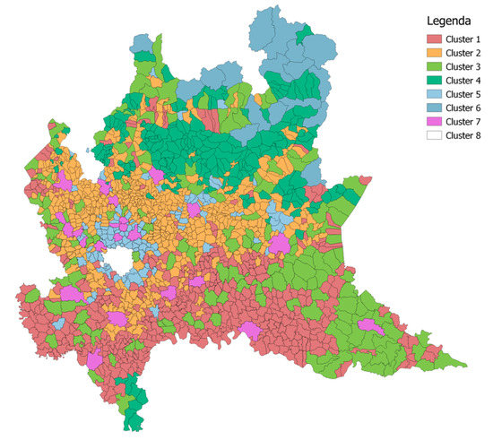 Geographical output of the cluster analysis with 7 clusters and the regional capital of Milan (cluster 8).