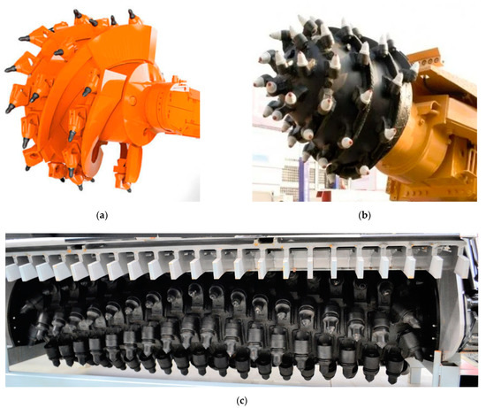 Cutting heads of: (a) a longwall shearer; (b) a roadheader; and (c) a road milling machine [13,14,20].