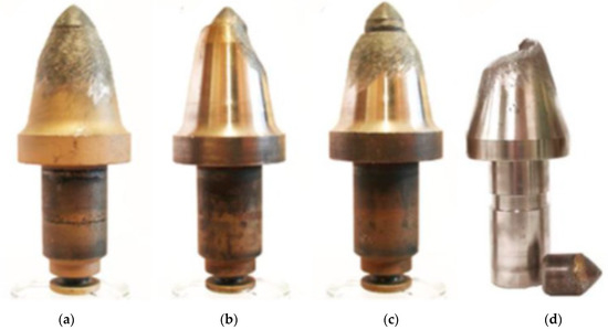 Worn conical picks: (a) properly (symmetrical); (b) improperly (asymmetrical); (c) with the tip exposed; and (d) with the tip falling out [37].