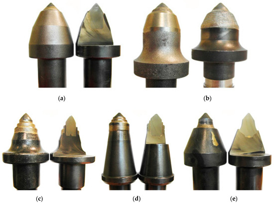 - Commercial picks for shaft-boring roadheaders—five pcs (Figure 11f);