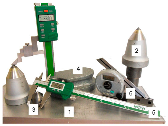 Instruments for measuring linear and angular dimensions: (1) surface plate; (2) conical pick; (3) WC-Co insert; (4) altimeter; (5) calliper; and (6) protractor [28,29].