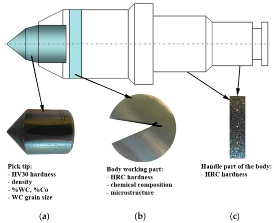 The required quality of conical picks is related to their appropriate construction (cutting angles, dimensions), material parameters of the pick body (chemical composition, hardness, microstructure, steel grade), and the pick tip (dimensions, HV30 hardness, density, chemical composition—determination of the mass fraction of carbide phase (%WC), matrix (%Co) and WC grain size).