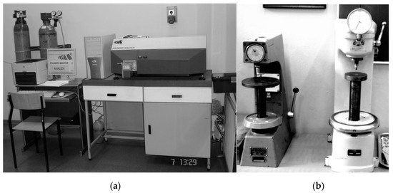 Instruments for metallographic measurements: (a) Foundry Master device; (b) hardness testers produced by Vickers and Rockwell [29].
