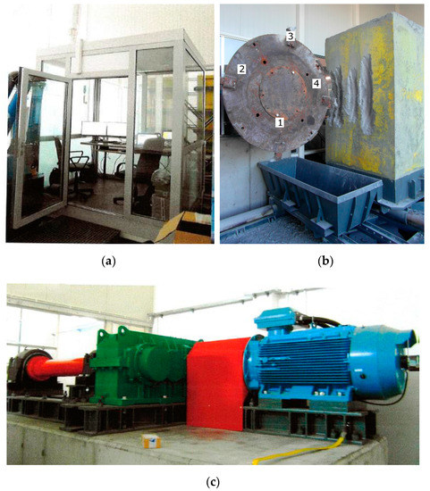 Laboratory test stand for testing by cutting or rotary drilling with single cutting tools or heads: (a) operator’s cab; (b) concrete sample as well as a test cutting head; (c) head drive [29,37].