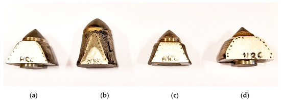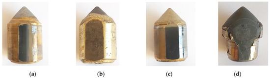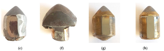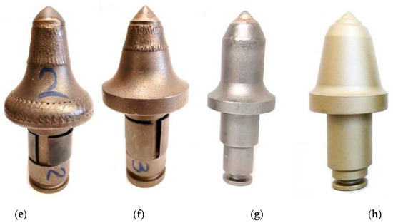 Five pieces of each type of conical pick were assigned for testing. One pick was intended for material tests, and the other four were for measuring the design parameters and the wear rate. The pick’s bodies were made of various grades of steel and reinforced with various cemented carbide (WC-Co) inserts. The surface of the working part of the pick body was protected with various padding welds—reinforced picks (Figure 11b–f)—or was not protected—standard picks (Figure 11a,c,g,h). The following picks were used for testing: