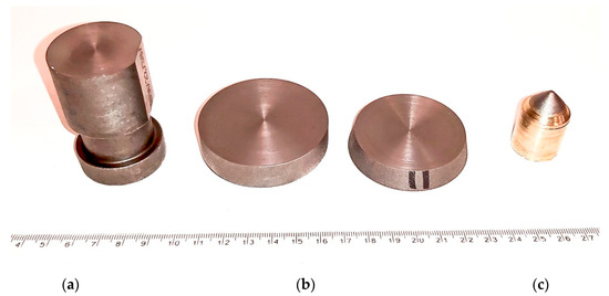 As mentioned before, one pick from each batch of picks was intended for material testing. For this purpose, samples from the steel body of each pick were obtained in the process of machining (Figure 13a,b), and tips in the form of sintered carbide inserts (Figure 13c) were obtained.