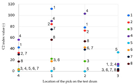 C2 index values for individual picks and their locations on the test drum.