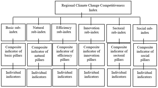 The Regional Climate Change Competitiveness Index is a means to evaluate the ability of a region to use factors of competitiveness for the formation of a competitive position of the region under climate change conditions. The pursuit of the principle of methodological reliability, which is essential for the method of competitiveness measurement, is grounded in the analysis of the choice of competitiveness pillars featured in the literature. It is also based upon their combination into a common system, as well as upon a methodological analysis of competitiveness measured by the index. The index was designed with three objectives in mind. First of all, the index is to reflect the multi-aspect character and latent nature of competitiveness. The index estimate of the latent dimensions of competitiveness is viewed as a linear combination of the individual indicators. Secondly, the index includes the diversified weight of the sub-indexes in order to obtain the full view of competitiveness. The structure of the index stems from the premise that it constitutes a function of pillars that can be grouped into six broad sub-indexes: Basic, Natural, Efficiency, Innovation, Sectoral, and Social. In turn, each of the sub-indexes is a function of the pillars. Figure 2 shows a synoptic view of the aggregation framework followed to build the RCCCI.