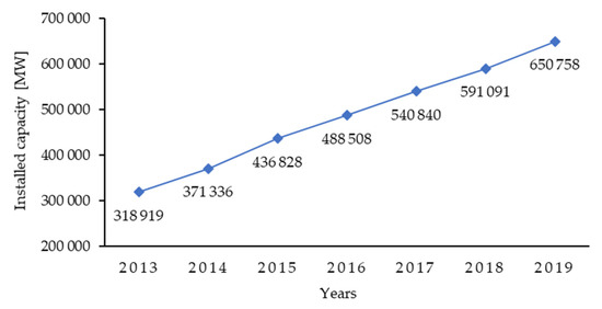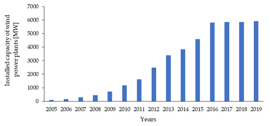 Tremendous advances have occurred in the renewable energy sector in recent decades, among which one of the most important is wind energy. As shown in Figure 1, the rate of growth of global total installed wind power capacity increased annually from 2013 to 2019. Investments in onshore and offshore wind energy worldwide amounted to EUR 128 billion in 2019, compared with EUR 87 billion in 2010, an increase of 38.5% [1]. In Poland, wind energy is the most dynamically developing branch of the renewable energy sector. According to the Energy Regulatory Office (ERO), the total capacity of wind turbines in Poland at the end of 2019 was 5917.243 MW. There are several dozen active wind farms in Poland, mostly located in the northern and central parts of Poland [2]. The ERO regularly reports the installed capacity of each type of renewable energy source in Poland (installations using biogas, biomass, solar energy, wind energy and hydropower). Table 1 shows the installed capacity of all renewable energy source (RES) installations in Poland in 2010, 2015 and 2019; all types increased in installed energy capacity during this period. Further details are shown in Figure 2, which presents the installed capacity for wind power plants over the period 2005–2019. These increases in capacity reflect the expansion of wind installations, which, according to data from the ERO, increased from 981 at the beginning of October 2015 to 1207 by the end of 2019 (single turbines and farms) [3]. Table 1 clearly shows that the highest share of installed capacity at each time point is from wind power plants. In 2019, wind power plants represented nearly 65% of total installed RES capacity in Poland [3,4] and produced 13.9 TWh of electricity, an increase of almost 19.1% compared with the previous year. However, when considered in relation to total domestic electricity generation, wind energy was responsible for only 8.75% of total energy generated [5].