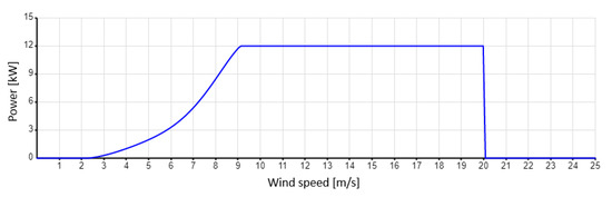 Figure 4 presents the energy characteristics of the analyzed wind turbine as a power output curve, which shows the relationship between the wind speed captured by the rotor and its electrical output. The power curve allows the amount of electricity generated by the turbine to be estimated [31] and is an essential component of wind turbine performance assessment. When the detailed characteristics of wind conditions in a given location are known, the annual electricity production of a turbine can be forecast very accurately on the basis of the power curve, and the economic viability of the investment can be assessed [32]. This type of analysis is at the core of the present paper.