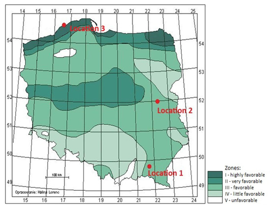 Based on many years of meteorological observations (the survey was carried out during the 1971–2000 period), the IMWM has developed a map of the intensity and magnitude of wind currents in Poland. This map divides the country into five zones that differ in attractiveness for wind energy power plants. Zone I, the most advantageous, is located in the coastal zone. Successive zone numbers indicate progressively weaker wind conditions. Figure 5 presents a map of Poland marked with the five wind zones as well as the three locations at which the analyzed measurements were obtained.