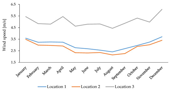 Distribution of average monthly wind speed at the three locations for the period 2014–2018.