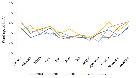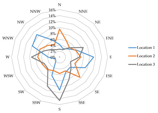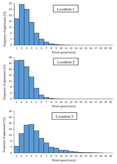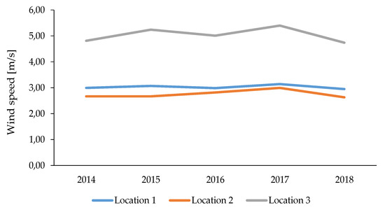 Figure 9 shows the distribution of wind direction at the three locations in 2018. At Location 1, there were three dominant wind directions with similar frequencies of approximately 11%: northwestern, eastern and southern. At Location 2, the wind directions were less diverse, with no wind direction exceeding 10%, but were most often from the north and southeast. At the coastal Location 3, the most frequent wind direction was southern, with a frequency of 14.62%, reflecting the strong influence of the sea breeze. The average annual wind speeds for each location are shown in Table 3 and Figure 10. At each location, the average wind conditions were similar throughout the study period, with slightly higher wind speeds in 2017. Compared with the other two stations, Location 3 clearly features much more favorable wind conditions, consistent with its location in Poland’s wind zone I. Locations 1 and 2 are located in wind zone III and thus exhibit similar wind speeds and similar disparities compared with Location 3.