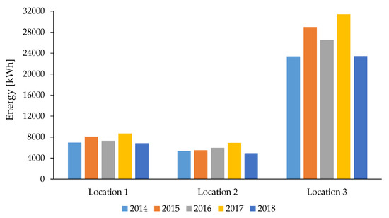 The results of the simulations of energy production at the three selected locations for the period 2014–2018 are shown in Table 4 and Figure 11. Based on the calculated total energy produced over a period of five years, Location 3 is definitely the most effective location, with more than four times greater energy production compared with either of the other two locations.
